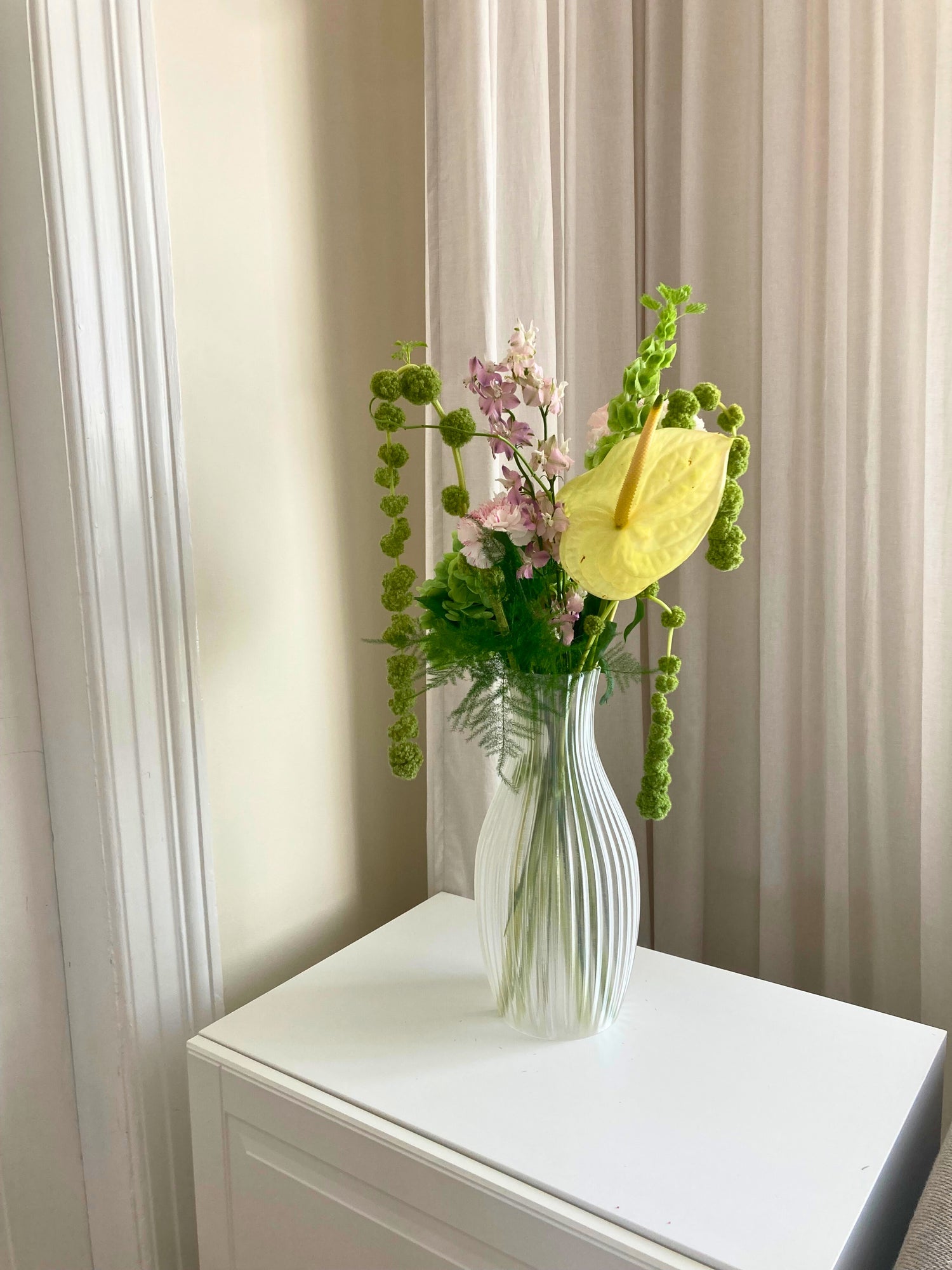 Swirl is a breathtaking and eye-catching vase, inspired by the elegant swirls of the wind. When the sun's rays hit this beauty, it creates a magical light that is a delight to the eye. Even without flowers, Swirl is an exquisite decoration that brightens up any room